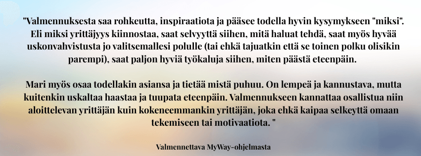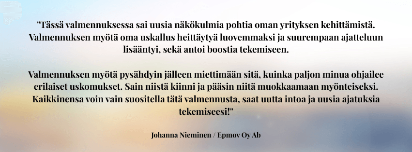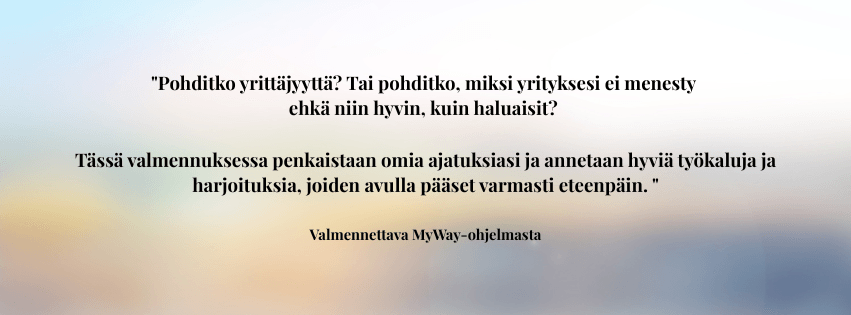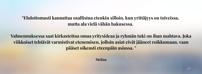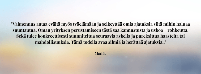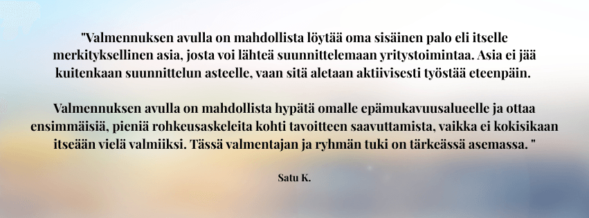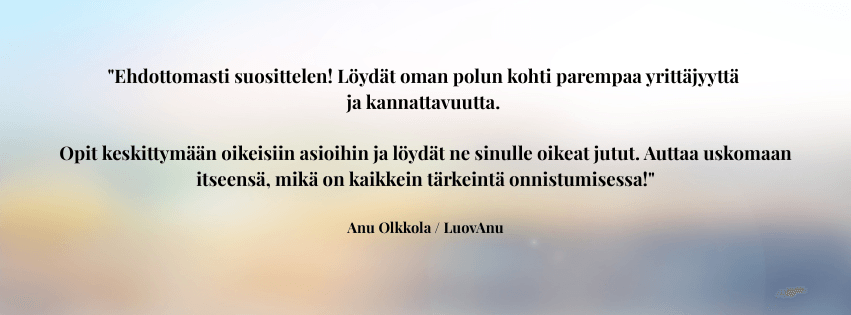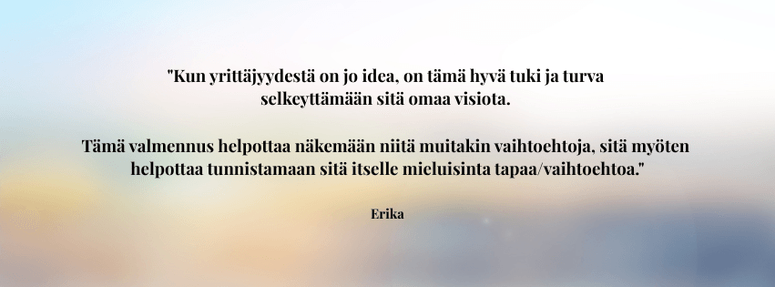 Sinulla on haave tai tavoite jo vähintään jollakin tavalla mielessä, mutta et ole oikein päässyt vielä eteenpäin. Selkeys, energia ja ehkä uskalluskin puuttuu. Kaipaat tsemppiä ja inspiraatiota. Haluat luoda omannäköisen bisneksen joka mahdollistaa paremman arjen.