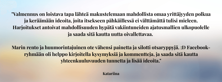 Sinulla on jo olemassa oleva yritys tai ainakin tiedät jo, mitä haluat rakentaa. Kaipaat sparrausta ja boostia tekemiseen. Haluat selkeän, etenevän prosessin ja tehtävät, joita seurata, jotta voit keskittyä itse sisältöön ja saada asiat tapahtumaan!